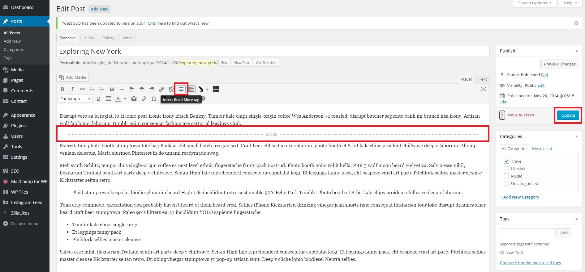 Also known as “Read More” tag, you can add the Continue Reading button to a post within creating/editing a post screen, select the button in your post tools called “Insert Read More Tag”. A horizontal dash line will appear in your post. This is where your “Continue Reading” button or your “Read More” button will appear when your post is displayed on the homepage. Any text you put underneath that horizontal dash line will not appear on your homepage. Be sure to click ‘Publish’ button when you’re finished.