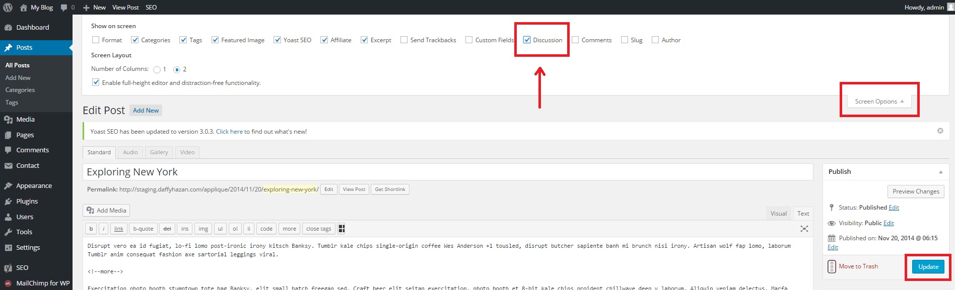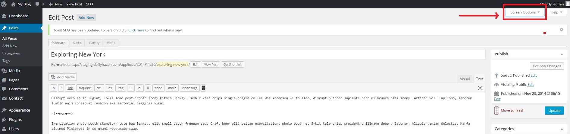 Open up your page’s or post’s create/edit screen. In the top-right corner, you’ll see a little tab titled “Screen Options”. Click this tab and another menu area will drop down from the top.