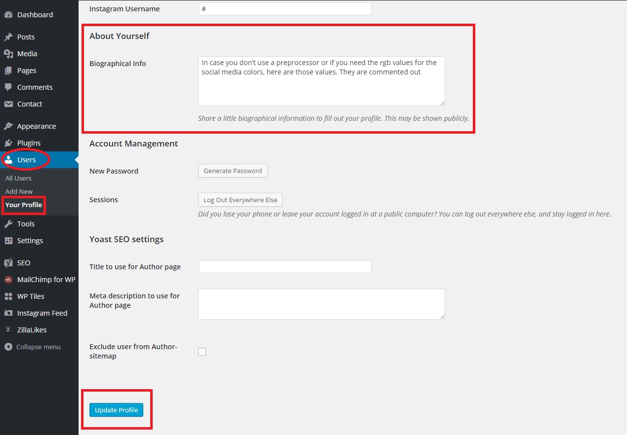 Navigate to WordPress Dashboard > Users > select the user you’d like to add social icons for. In this option you will see the various social media network that WordPress offers. To have a social network’s icon appear within the Author Box, find the option titled “Contact Info” and just simply copy & paste your account’s URL to the text box.