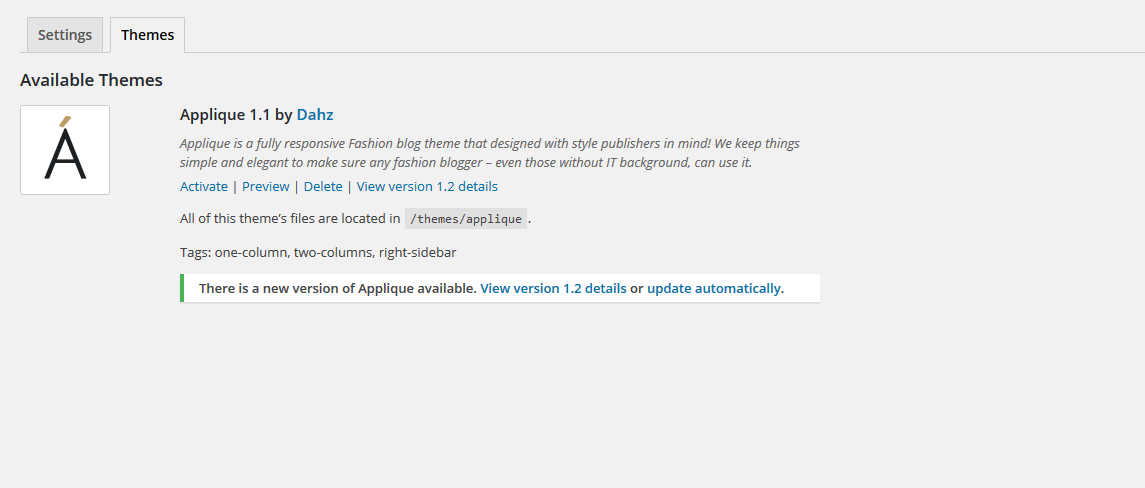 - Once you’ve activated another theme, still within Appearance > Themes, click on Applique theme then find delete button In the bottom right corner. Go ahead and delete it by clicking the link.
