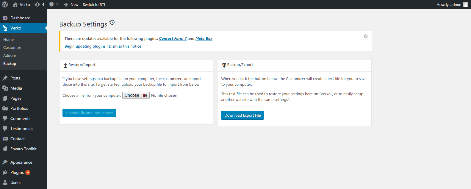 - Browse to Demo Content XML > Customizer > verko-agency.json/verko-app one page.json/verko-main-demo.json from extracted theme package.