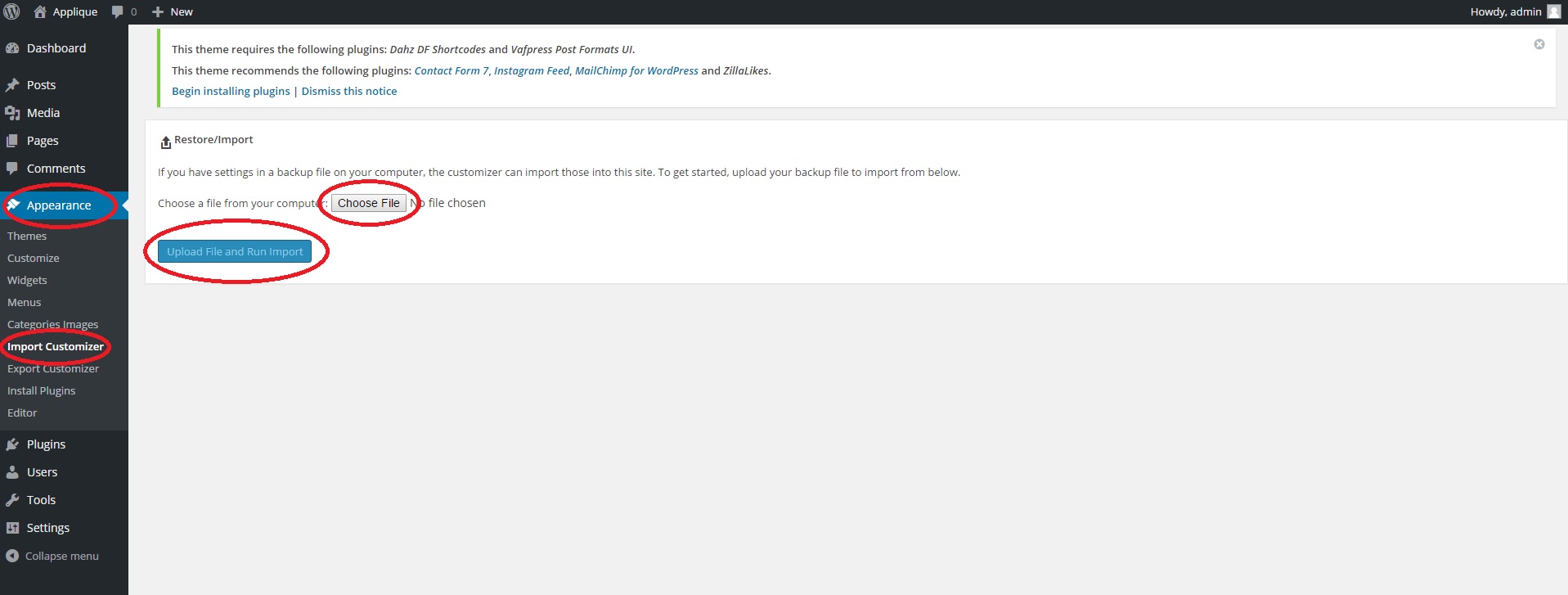 To Import the demo theme’s setting go to WordPress Dashboard > Appearance > Import Customizer and choose file. Then upload the desired .json file and click ‘Upload File and Run Import’ button.