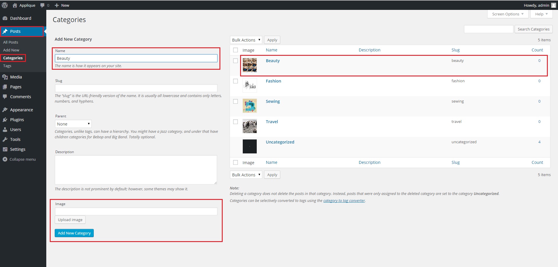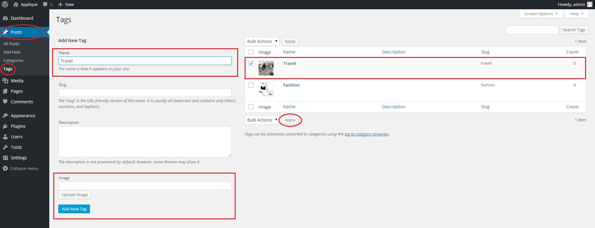 To add a new image in Tag, write your name category first in the box below option titled “Add New Tag”. Then find the option titled “Image”, upload your image and be sure hit the “Add New Tag” button.
