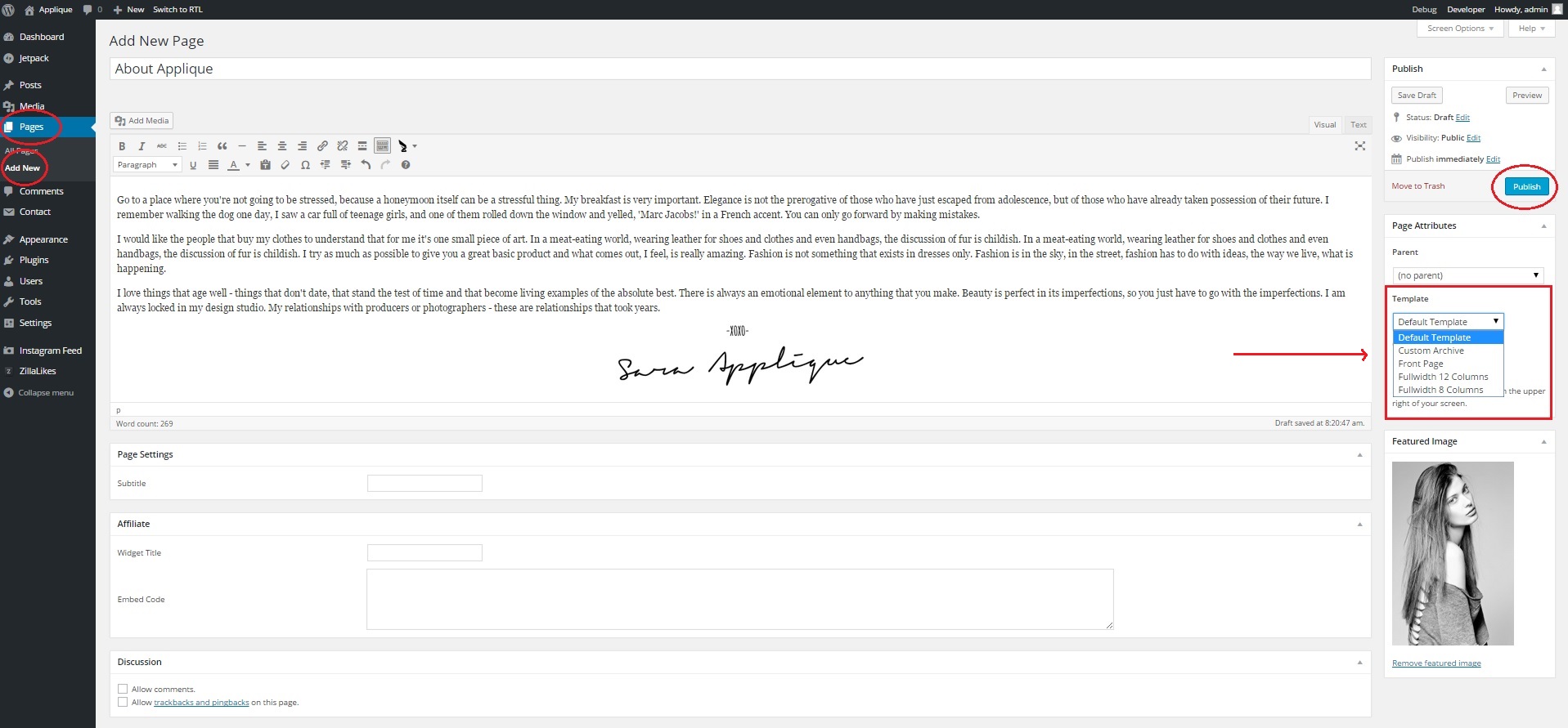 Like a post, you can enter a page title, add content, and assign a featured image.