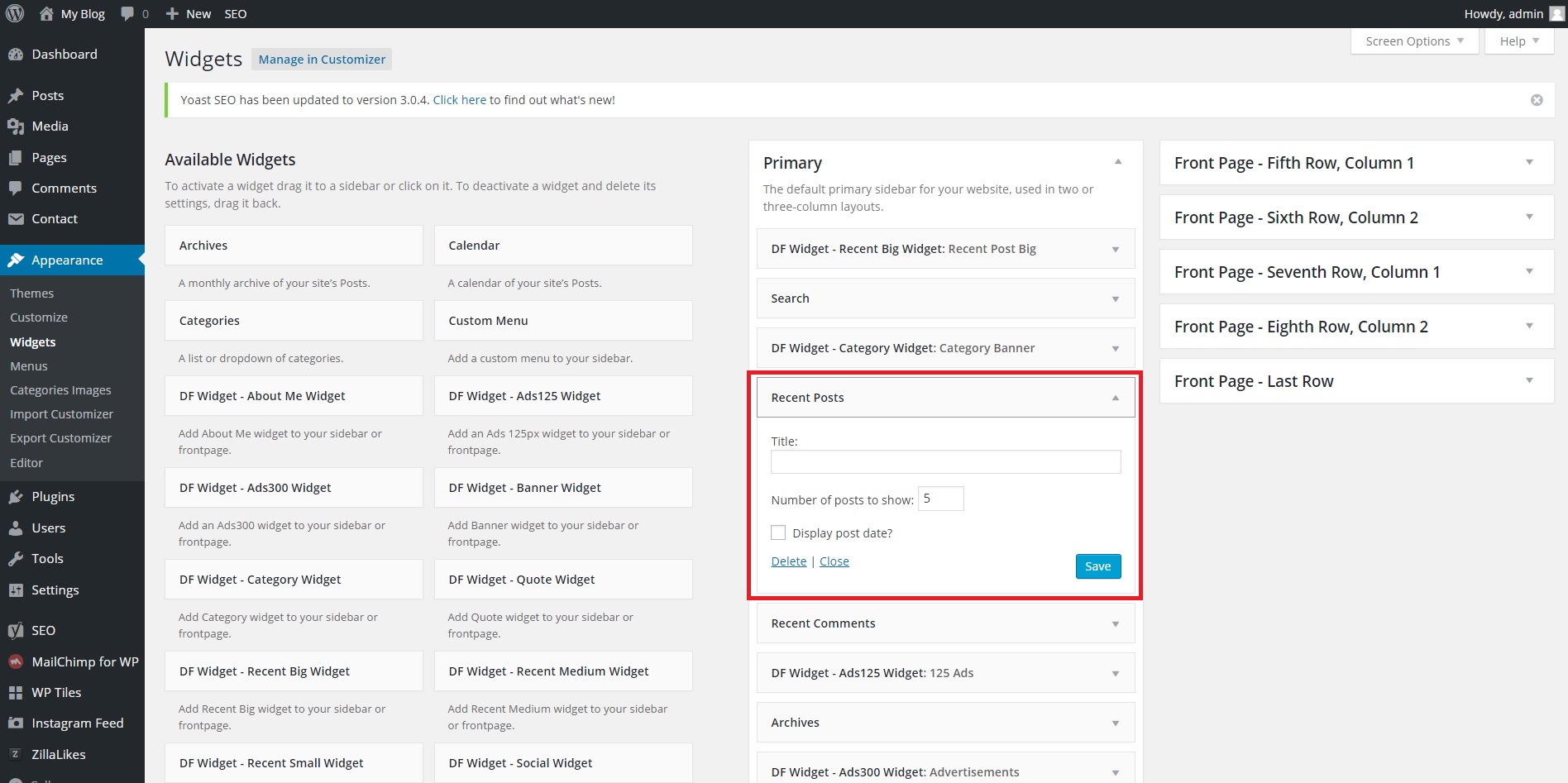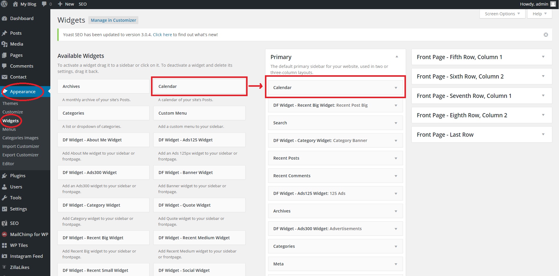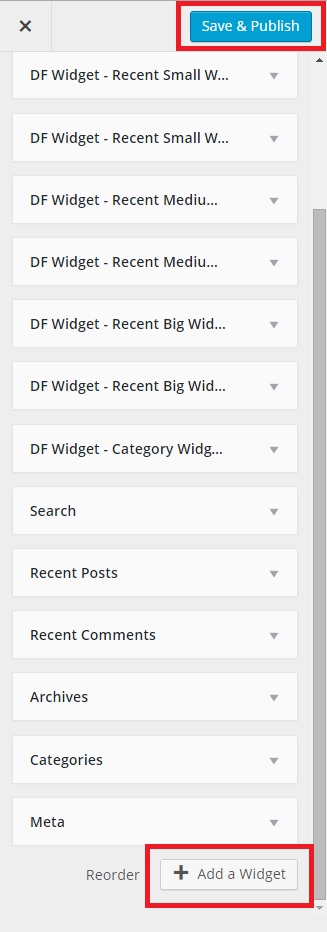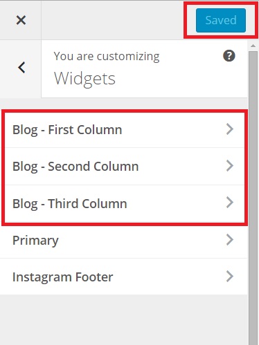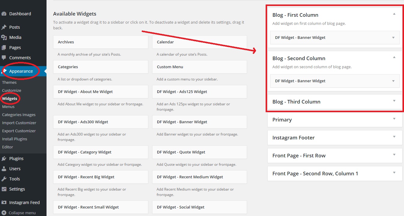 Or, you can add the widget within WordPress Dashboard > Appearance > Widgets > choose the Blog Column that you desired (see the screenshot below), and then add the widgets.
