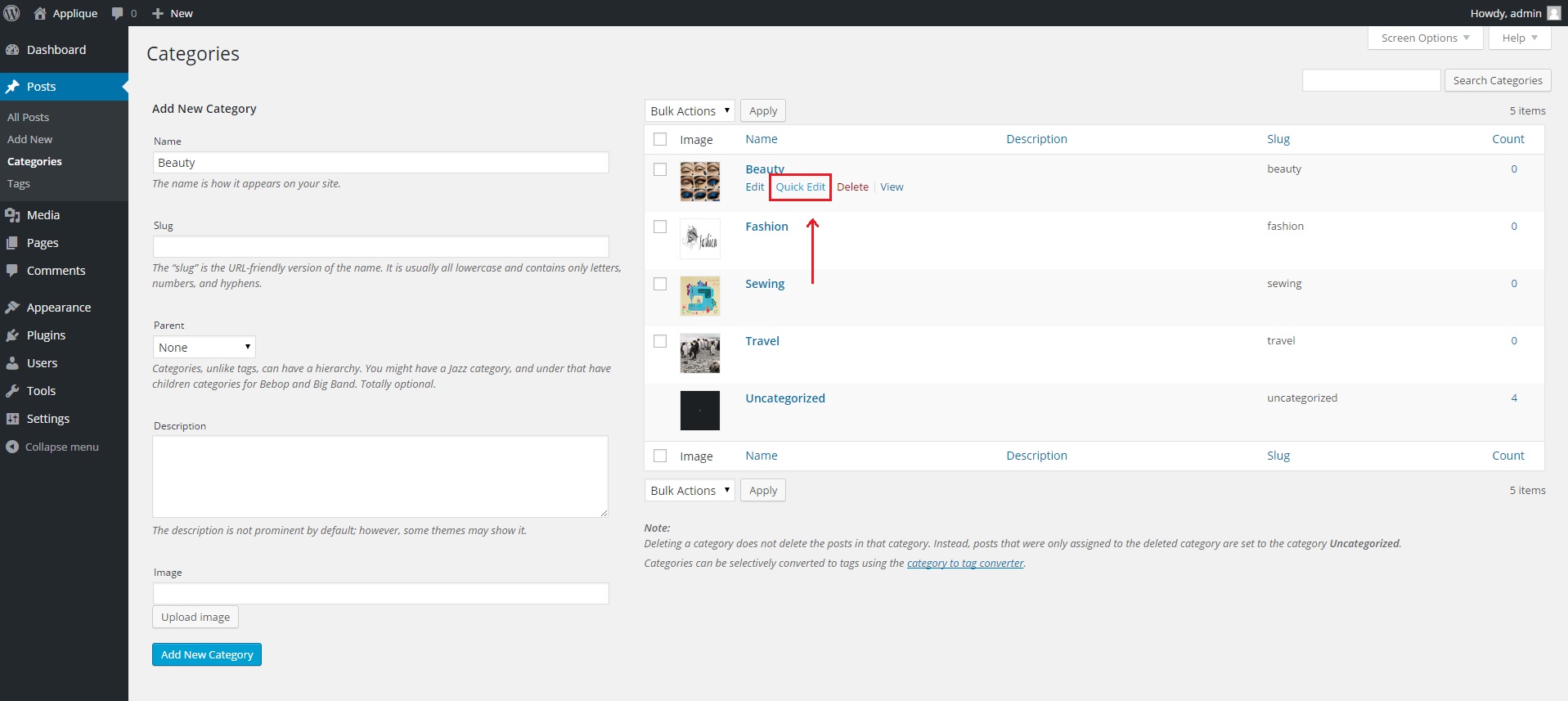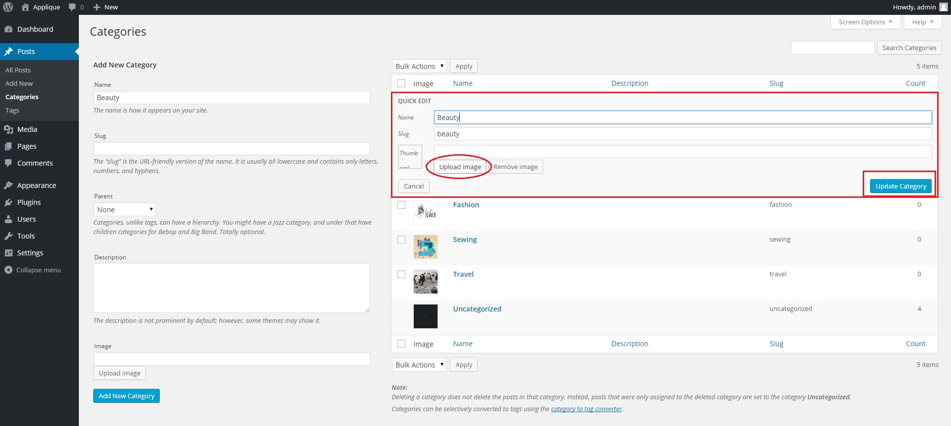 Additionally, if you’d like to change your image category, see on the right of the screen there are a list of your categories that already created. Choose which category that you want to change the image. Then, hover your mouse into category list that you desired and simply clicking “Quick Edit” and upload your image.