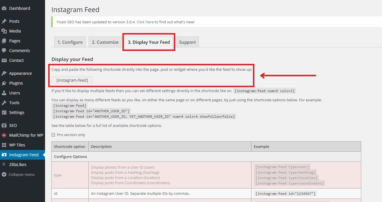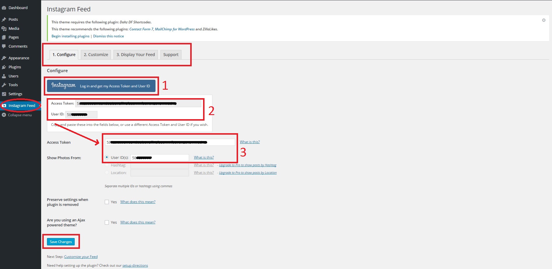 After you installed & activated this plugin, it will automatically appear at your Dashboard titled ‘Instagram Feed’. In this screen you’ll see the configuration, customize, and display your feed. But, the most important is to configure your Instagram first by logging in your Instagram user ID. After, you will get Access Token ID (see the screenshot below), then copy & paste the ‘Access Token’ & ‘User ID’ to the box below it. Be sure, before you go to Customize click the ‘Save’ button first.