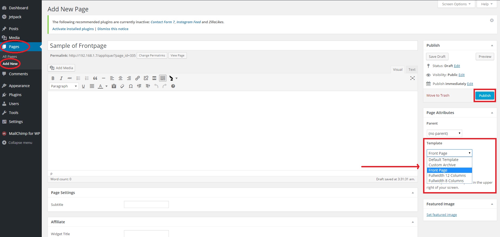 You have to create your page first, navigate to WordPress Dashboard > Pages > Add New > write your title > Page Attributes, choose the ‘Front Page’ template (see screenshot below) > click ‘Publish’ button.