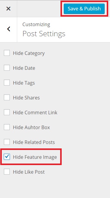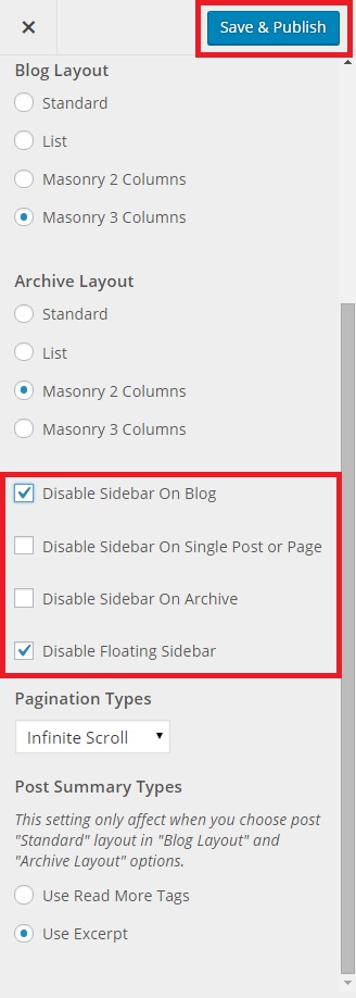 Here, you can check or uncheck the boxes next to “Disable Sidebar on Blog”, “Disable Sidebar on Single Posts or Page”, “Disable Sidebar on Archive”, and “Disable Floating Sidebar”. Be sure to click ‘Save & Publish’ button if you’re finished.