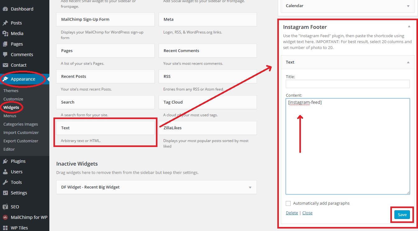 Now to get your Instagram Feed appear on your footer, go to Appearance > Widgets > drag the ‘Text’ widget and drop it in ‘Instagram Footer’ (see the screenshot below). Then, copy the following shortcode and paste into the ‘Content’ box.