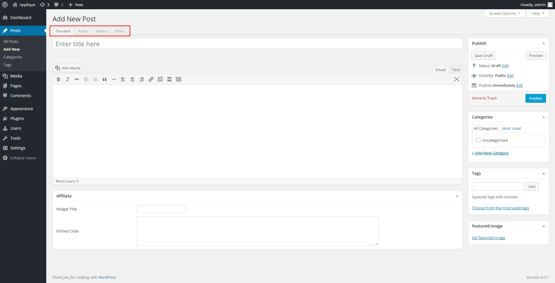 First thing you have to know that Applique is already integrated with Vafpress Post Format UI plugin, and has 4 possibilities of different types of posts: standard, audio, video, and gallery.