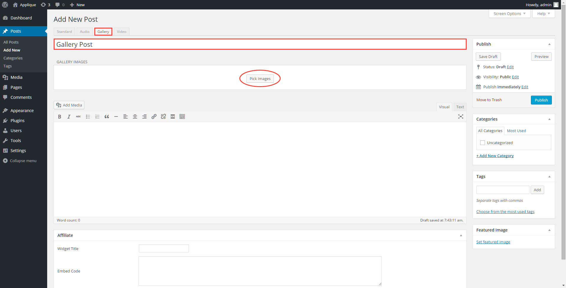 A gallery post allows you to create a slideshow-type gallery at the top of your post. After clicking the “Gallery” tab to choose this post format option, click the “Pick Images” button within the “Gallery Images” box that appeared. Select whatever images you’d like from your WordPress Media Library.