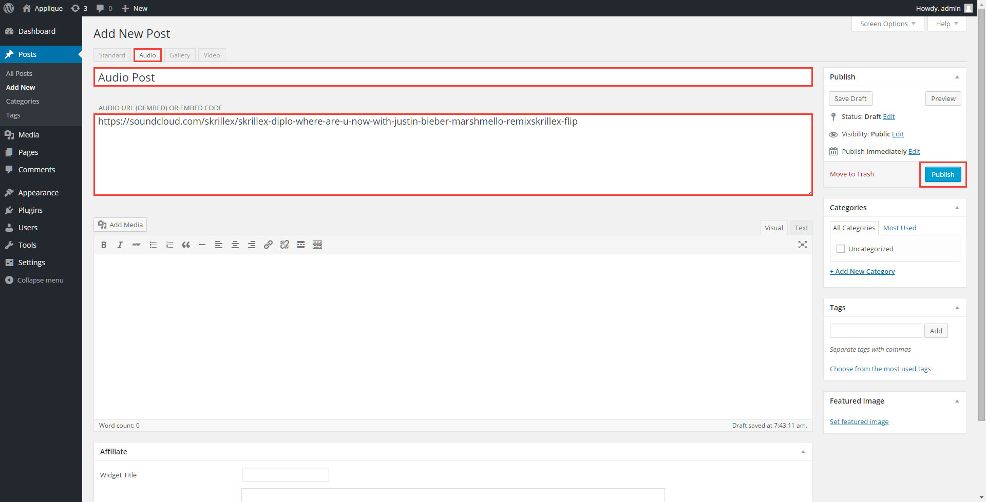 An audio post allows you to share a music or audio track and displays it at the top of the post. Simply copy & paste the track’s URL, or embed code into the special audio input box.