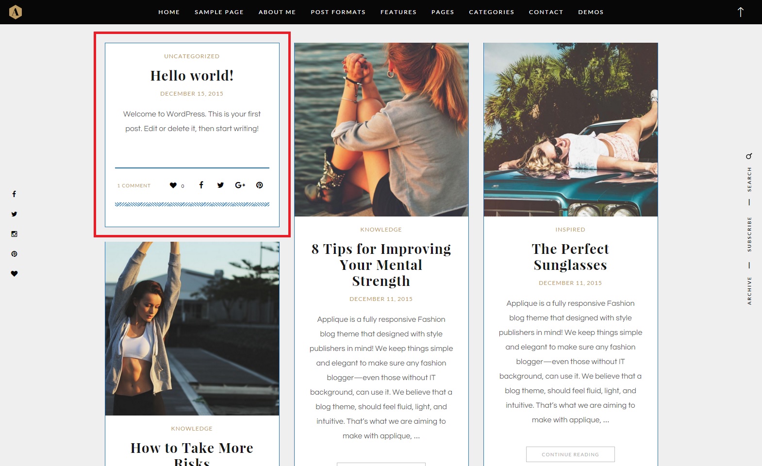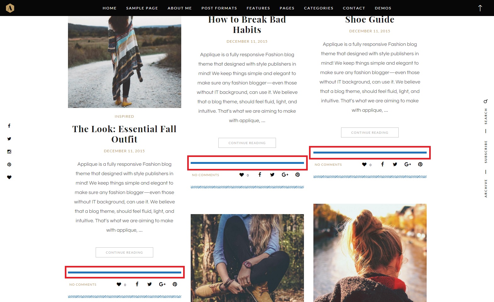 To learn about how to add the Continue Reading button seen on the demo site to your posts, check out this article: How do I add the “Continue Reading” button to posts in Applique?