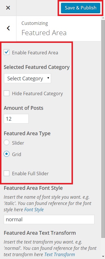 - Lastly, navigate to Appearance > Customize > Featured Area > and check the box next to “Enable Featured Area”. Additionally, you can select the specific your featured area by: