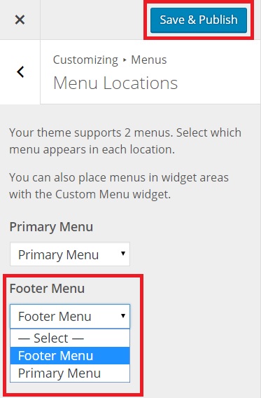 You can create your menu in footer by navigate to WordPress Dashboard > Appearance > Menus > Menu Locations > Footer Menu > click the drop-down menu to choose the desired menu. Be sure to click ‘Save & Publish’ button.