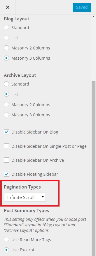 Still on this screen, scroll down and choose ‘Pagination Types’ option (see screenshot below), there are 3 types: Old and New, Number, and Infinite Scroll, you can choose your desired type.